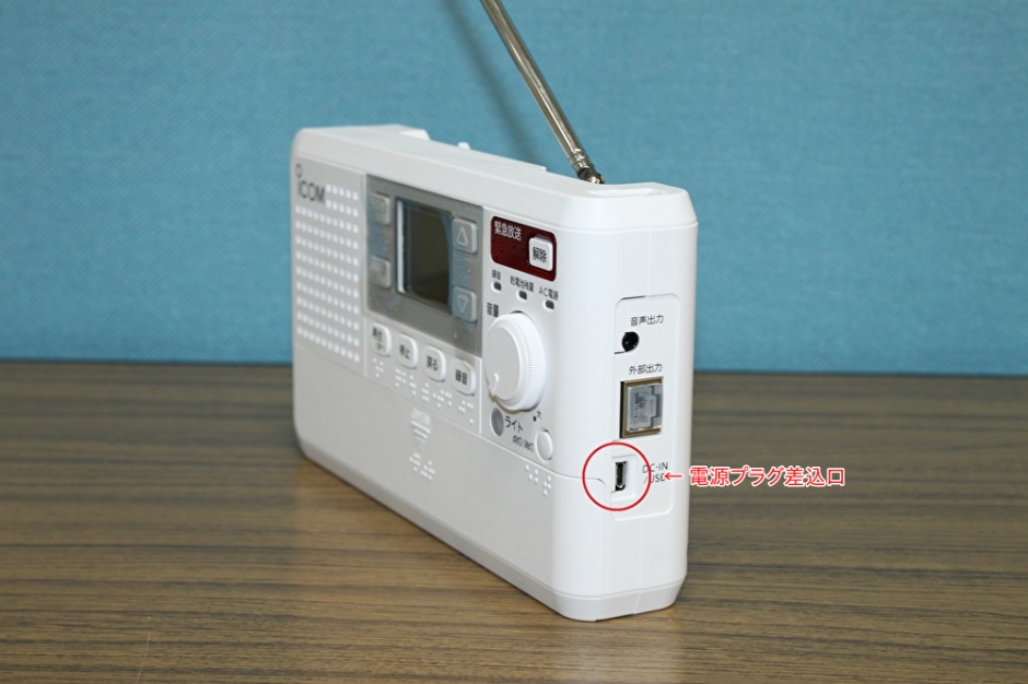 戸別受信機本体の右側面下部にある穴(接続ジャック)にACアダプターの電源プラグを接続します
