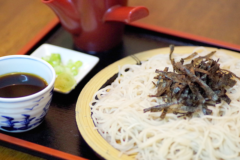 「ざるそば」は細めの麺が特徴のお店の人気メニューです。細めの麺が濃いめのつゆに合います。